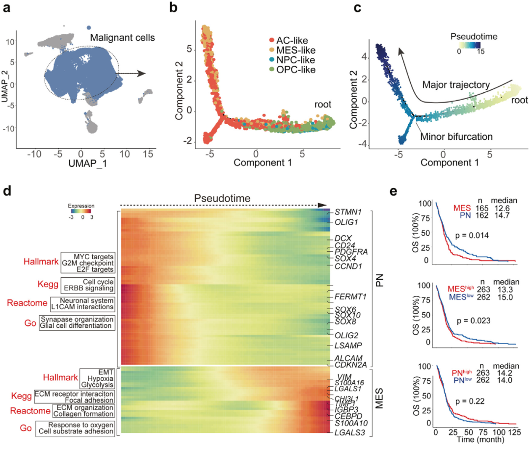 利用細(xì)胞軌跡分析,探索GBM不同腫瘤亞型間的分化關(guān)系,結(jié)果顯示擬時(shí)間線上主要由NPC-和OPC-like 腫瘤細(xì)胞逐漸分化為AC-和MES-like腫瘤細(xì)胞,同時(shí)有個(gè)小分支為AC-like腫瘤細(xì)胞,揭示了GBM的可塑性和前神經(jīng)元型(proneural, PN)到間質(zhì)型(mesenchymal, MES)的動(dòng)態(tài)過渡(圖2a-c);PN與細(xì)胞周期、G2M檢查點(diǎn)和神經(jīng)膠質(zhì)細(xì)胞分化相關(guān)的通路顯著富集,表明PN具有高度增殖性和可塑性,而MES與上皮-間充質(zhì)轉(zhuǎn)化(EMT)、缺氧、ECM組織和細(xì)胞粘附相關(guān)的通路顯著富集(圖2d);利用TCGA數(shù)據(jù)集進(jìn)行生存分析,結(jié)果顯示,與PN組相比,具有MES-like轉(zhuǎn)錄組特征的患者總生存期較差,而與MES-low組相比,MES-high組預(yù)后更差,表明具有間充質(zhì)特征的GBM患者的生存結(jié)局較差(圖2e)。Tips:利用TCGA數(shù)據(jù)庫中的臨床數(shù)據(jù),將單細(xì)胞數(shù)據(jù)中鑒定到關(guān)鍵maker基因或基因集進(jìn)行生存分析,是探討臨床意義的有效途徑。