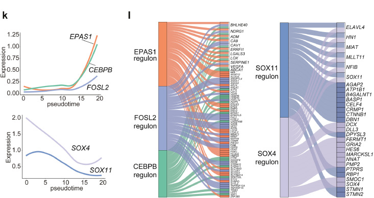 利用SCENIC分析PN或MES細(xì)胞中的關(guān)鍵轉(zhuǎn)錄調(diào)控網(wǎng)絡(luò),結(jié)果顯示,轉(zhuǎn)錄因子E2F1、SOX9、RARA、SOX11和SOX4在OPC和NPC細(xì)胞中差異過表達(dá),而 EAPS1、CEBPB、FOSL2、STAT2和EGR1在MES和AC細(xì)胞狀態(tài)中差異過表達(dá),細(xì)胞軌跡分析證實(shí)了PN-MES轉(zhuǎn)換過程中EPAS1、CEBPB和FOSL2的激活以及SOX4、SOX11的下調(diào)(圖2k)。以上結(jié)果突出了從PN到MES細(xì)胞狀態(tài)的動(dòng)態(tài)轉(zhuǎn)變主要是由關(guān)鍵轉(zhuǎn)錄因子驅(qū)動(dòng)的。
