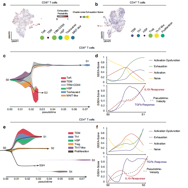 該團隊對?8?名診斷為新發(fā)膠質母細胞瘤的患者腫瘤組織樣本進行了單細胞測序和數據分析,發(fā)現“S1”狀態(tài)與?T?細胞耗竭/功能障礙標志物(HAVCR2、CTLA4?和?PDCD1)的表達增加,為了確定與?T?細胞耗竭相關的轉錄途徑,進行了通路信號傳導推斷,揭?示了?T?細胞耗竭與?IL-10?以及部分?TGF??反應之間存在著相關性。