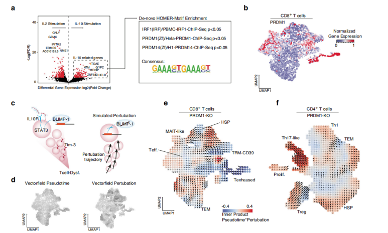 該團隊通過擾動模擬,用IL-10刺激所產生scRNA-seq數據集富集分析推斷常見轉錄因子結合位點,發(fā)現ChiP-seq數據中基因BLIMP-1和IRF1峰之間密切重疊,IRF1和PRDM1/14結合位點的顯著富集,提出了“IL10-STAT3-BLIMP-1信號軸可能是腫瘤相關T細胞耗竭的潛在驅動因素”的假設。為了進一步驗證猜想,作者對PRDM1進行了計算機擾動模擬驗證,發(fā)現膠質瘤母細胞瘤微環(huán)境中髓樣細胞分泌IL-10驅動誘發(fā)T?細胞耗竭。