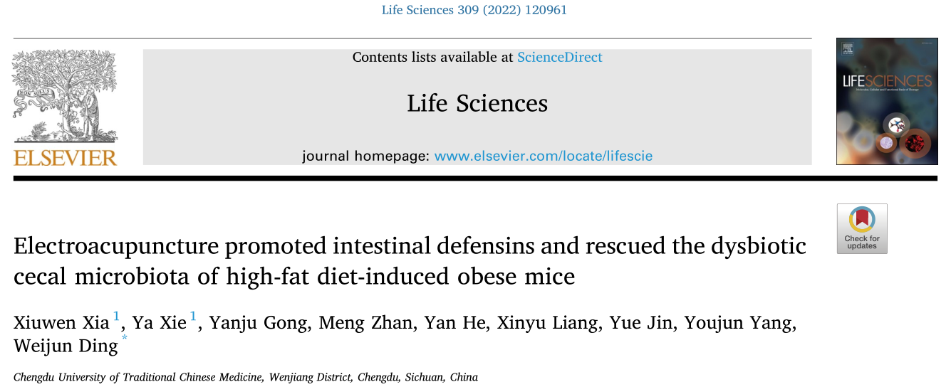 Xia X, Xie Y, Gong Y, et al. Electroacupuncture promoted intestinal defensins and rescued the dysbiotic cecal microbiota of high-fat diet-induced obese mice. Life Sci. 2022;309:120961. doi:10.1016/j.lfs.2022.120961