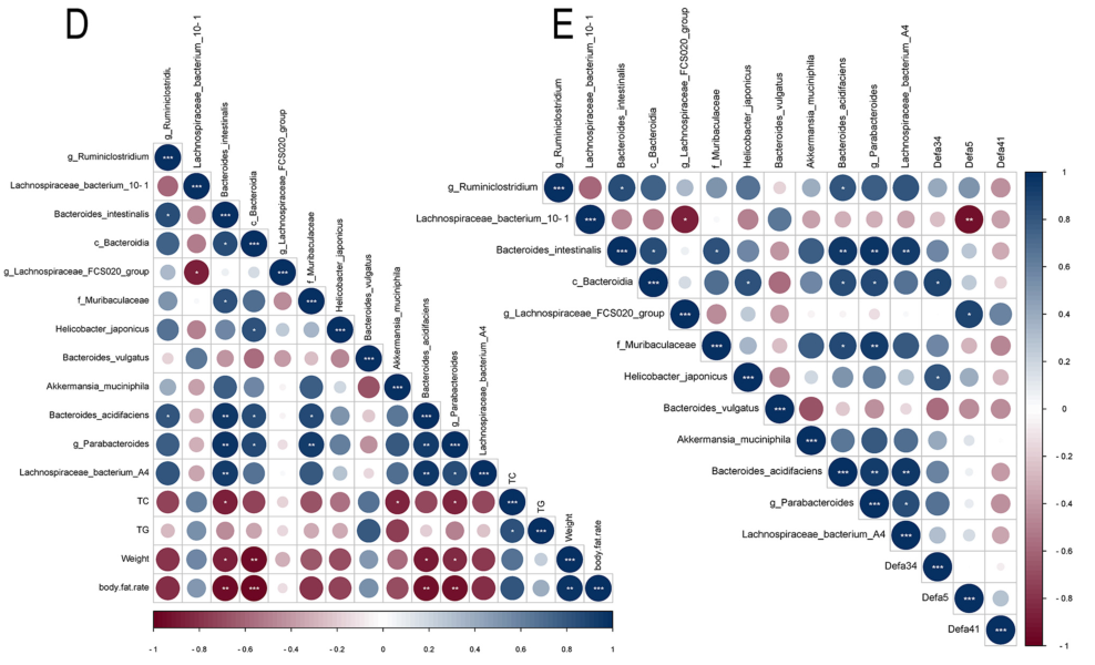 4. Defa5水平與毛螺菌科呈正相關(guān),與肥胖指標(biāo)呈負(fù)相關(guān),EA還可以減少組織炎癥,改善葡萄糖耐量異常,并抑制腸道脂質(zhì)吸收的關(guān)鍵基因。