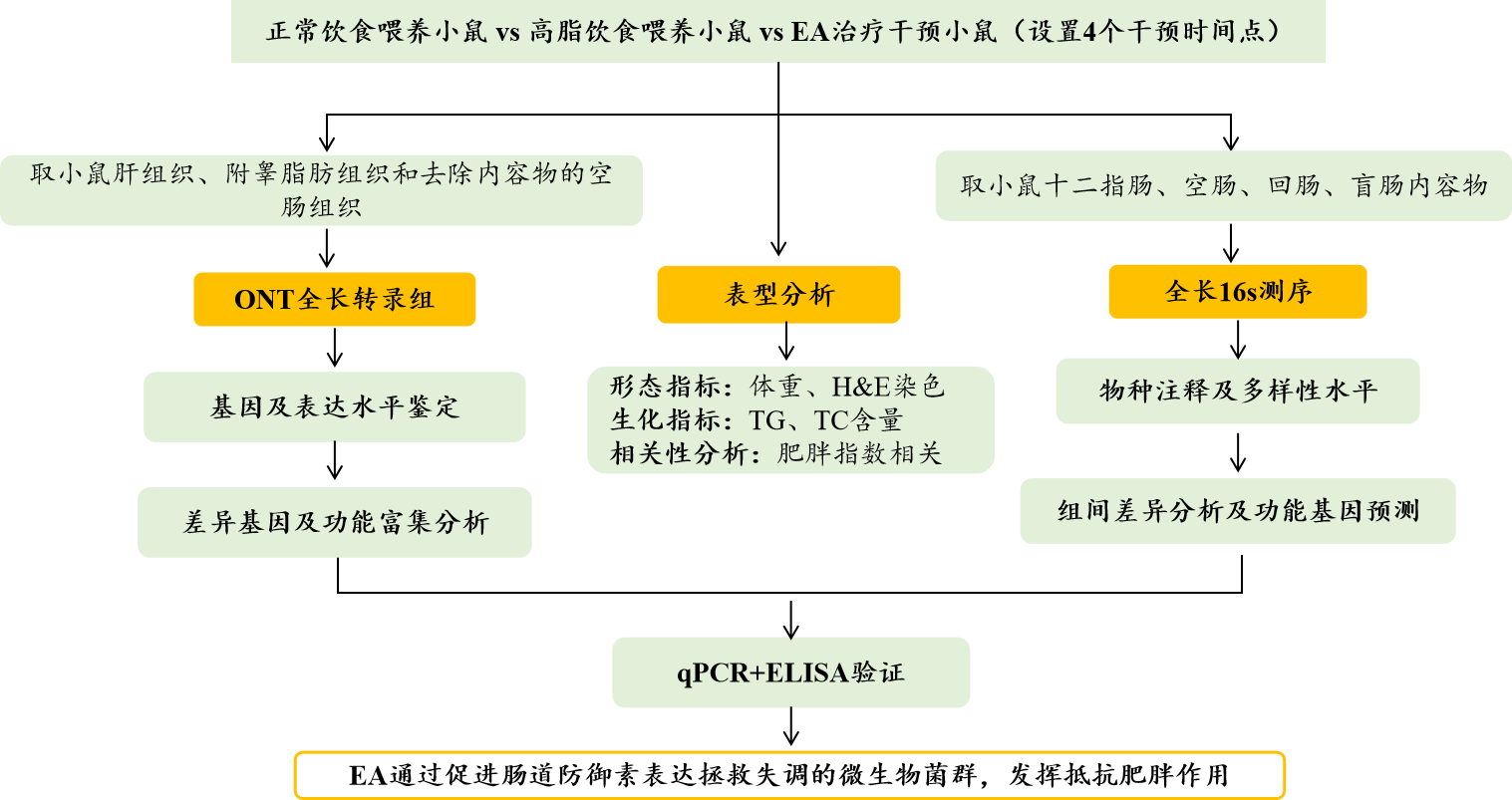 肥胖作為一種不斷增長的非傳染性流行病,影響了超過20億人。腸道微生物菌群失調(diào)已被證明是肥胖和肥胖相關(guān)疾病發(fā)生和進(jìn)展的關(guān)鍵因素,包括高血壓、II型糖尿病、血脂異常和非酒精性脂肪性肝?。∟AFLD)。針灸已被廣泛用于治療肥胖癥,研究報(bào)道,電針(EA)可以減輕肥胖小鼠的體重,挽救生態(tài)失調(diào)的腸道微生物群,還可以調(diào)節(jié)免疫力。然而,EAEA重塑腸道微生物群的潛在機(jī)制尚不清楚,如何通過腸道微生物菌群調(diào)節(jié)腸道先天免疫力對抗肥胖仍有待闡明。