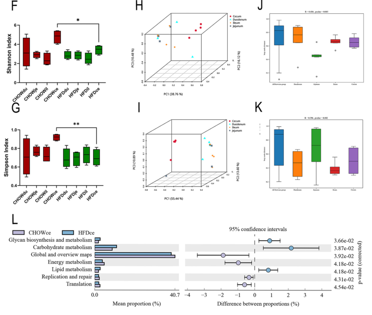 α多樣性分析結(jié)果顯示,高脂飲食HFD組與正常對照組的十二指腸、空腸和回腸微生物多樣性沒有顯著差異,但在盲腸中HFD組微生物多樣性顯著減少(圖1F, 1G);β多樣性分析結(jié)果顯示,與其他腸道段相比,只有盲腸微生物菌群在HFD組與正常對照組表現(xiàn)出顯著差異(圖1H, 1I);此外,top 15的KEGG通路中有7個(gè)是基于微生物功能富集,高脂飲食組盲腸微生物的上調(diào)通路包括脂質(zhì)代謝、碳水化合物代謝和聚糖生物合成和代謝,下調(diào)通路包括能量代謝相關(guān)途徑(圖1L)。