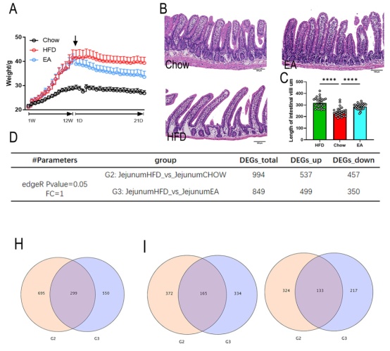 相較于HFD組,EA組顯示出顯著地減肥效果(圖2A),并減少了附睪、腎臟和腹股溝區(qū)域的脂肪堆積??漳c是腸道脂質(zhì)消化和吸收的主要區(qū)域,HFD小鼠的空腸絨毛明顯長于食物組(圖2B, 2C)。HFD組和正常對照組間共鑒定出994個(gè)差異表達(dá)基因DEG(圖2D-F),HFD組和EA組共鑒定出849個(gè)DEG(圖2G);通過取兩個(gè)比較組共有的DEG,作為EA直接調(diào)控肥胖的DEG,共檢測到共有基因299個(gè),其中上調(diào)的有165個(gè),下調(diào)的有133個(gè)(圖2H-J)。