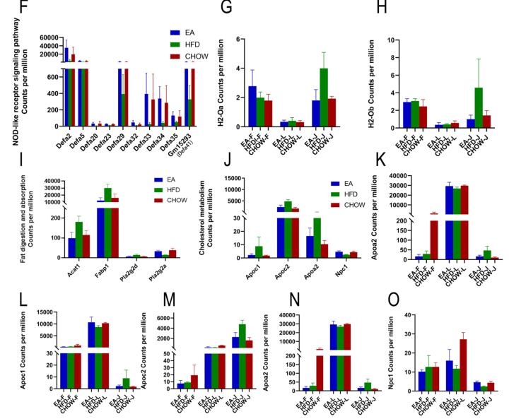 對共有DEG進(jìn)行功能富集分析,發(fā)現(xiàn)顯著富集的通路主要與宿主先天防御和脂質(zhì)代謝相關(guān)(圖3A);在去除功能未鑒定的基因或lncRNA后,獲得140個(gè)上調(diào)和92個(gè)下調(diào)的DEG也進(jìn)行功能富集分析(圖3B, 3C);然后,對top20通路的DEG進(jìn)行PPI調(diào)控網(wǎng)絡(luò)分析(圖3 D, 3E),結(jié)果顯示,EA主要上調(diào)的通路包括α防御素基因在內(nèi)的NOD樣受體信號通路(圖3 D),下調(diào)的通路脂質(zhì)代謝(包括脂質(zhì)消化和吸收途徑),以及免疫應(yīng)答相關(guān)通路(谷胱甘肽s-轉(zhuǎn)移酶和MHC II類相關(guān)基因)(圖3E)。基因表達(dá)直方圖顯示EA干預(yù)恢復(fù)大量異常表達(dá)的DEG,與腸粘膜免疫相關(guān)的DEG,如α防御素基因,可以通過EA顯著恢復(fù)(圖3F);與免疫反應(yīng)相關(guān)的H2-Ob和H2-OA僅在空腸區(qū)域下調(diào)(圖3G, 3H);EA干預(yù)恢復(fù)了fabp1、pla2g2d和acat1的表達(dá)水平,主要負(fù)責(zé)脂肪消化和吸收(圖3I);最后,EA干預(yù)通過下調(diào)apoc1、apoa2和apoc2以及上調(diào)npc1來調(diào)節(jié)膽固醇代謝(圖3J-O)。