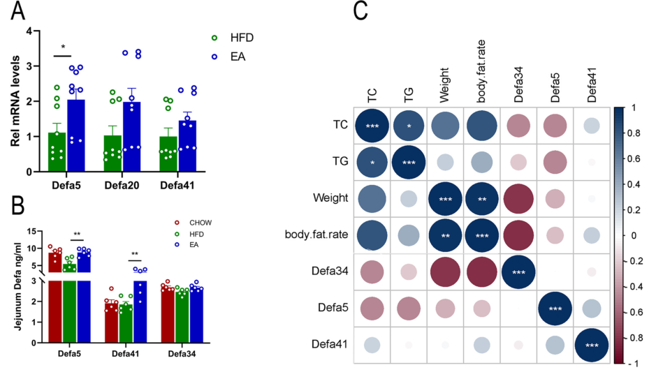 3.EA干預(yù)21天后,健康對照組的防御素α5(Defa5)表達(dá)恢復(fù),而肥胖小鼠空腸中包括fabp1在內(nèi)的脂肪消化吸收基因表達(dá)顯著降低;