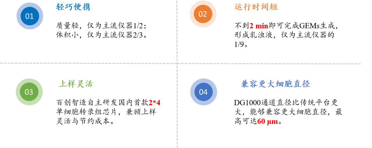 百創(chuàng)DG1000突破直徑壁壘:為了突破單細(xì)胞試劑耗材及儀器長期以來的國外技術(shù)壟斷,降低單細(xì)胞應(yīng)用的成本,突破主流平臺40μm細(xì)胞直徑限制,滿足更多的單細(xì)胞場景需求。經(jīng)過潛心研發(fā),百邁客發(fā)布了自主研發(fā)的單細(xì)胞微液滴系統(tǒng)-百創(chuàng)DG1000。