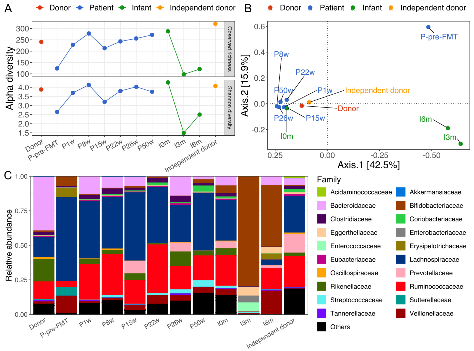 圖1. 供體、患者和嬰兒之間的腸道菌群組成差異。