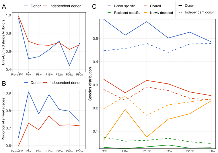 研究者進一步將患者 FMT 后腸道微生物群分為四類,即共有的、供體特異性的、受體特異性的和新檢測到的(圖2C)。結(jié)果表明,供體特定物種的百分比高,在第 1 周占 58.3%,并且在研究期間大致保持穩(wěn)定。相比之下,當在這些分析中使用獨立供體代替實際供體時,供體特定和共享物種的比例在所有采樣時間點都較低。此外,在 FMT 后跟蹤了轉(zhuǎn)移的供體特異性物種,發(fā)現(xiàn)其中超過 80% 的物種可以成功轉(zhuǎn)移并維持到 50 周,遠高于獨立捐贈者。由于供體特異性物種的轉(zhuǎn)移,根據(jù) BrayCurtis 相異性,F(xiàn)MT 后患者的腸道菌群組成與基線時(P-FMT 前)不同。盡管供體特異性物種在數(shù)量上所占比例大,但它們的豐度很低,并且主要來自擬桿菌科、毛螺菌科、梭菌科和瘤胃球菌科。因為豐度高的物種同時存在于供體和 preFMT 樣本中,無法檢測到細菌在物種水平上的轉(zhuǎn)移;因此,有必要對微生物轉(zhuǎn)移進行更深入的研究。