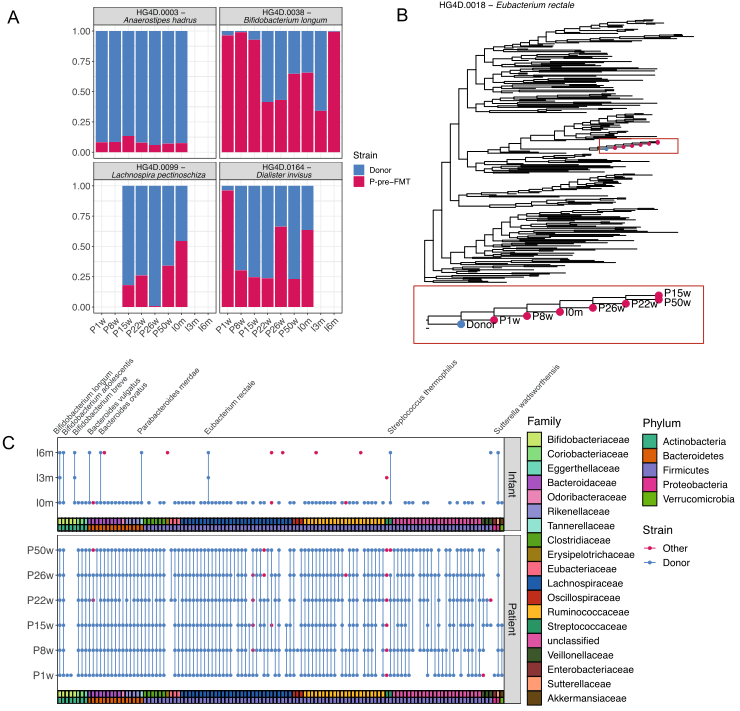 當觀察相同等位基因的百分比時,鑒定出120個不同物種的菌株轉(zhuǎn)移,這接近捐贈者樣本中檢測到的所有物種(241個)的一半。在這120種細菌中,有116種在一個或多個患者樣本中也被檢測到,其中99%(115/116種)從供者向患者轉(zhuǎn)移了菌株(圖3C)。此外,我們在一個或多個患者樣本中觀察到14個物種的替代菌株。在嬰兒樣本中,檢測到87個不同的物種,并在其中92%(80個物種)發(fā)現(xiàn)了供體菌株植入。然而,在這80種細菌中,87.5%(70種)只在胎糞樣本中發(fā)現(xiàn),在嬰兒以后的時間點在腸道中檢測到的供體菌株要少得多(3月樣本中3.8%[3/80],6月嬰兒樣本中12.5%[10/80])。有趣的是,當同一物種的菌株在治療后在母親體內(nèi)共存時,兩種菌株也會轉(zhuǎn)移給嬰兒。