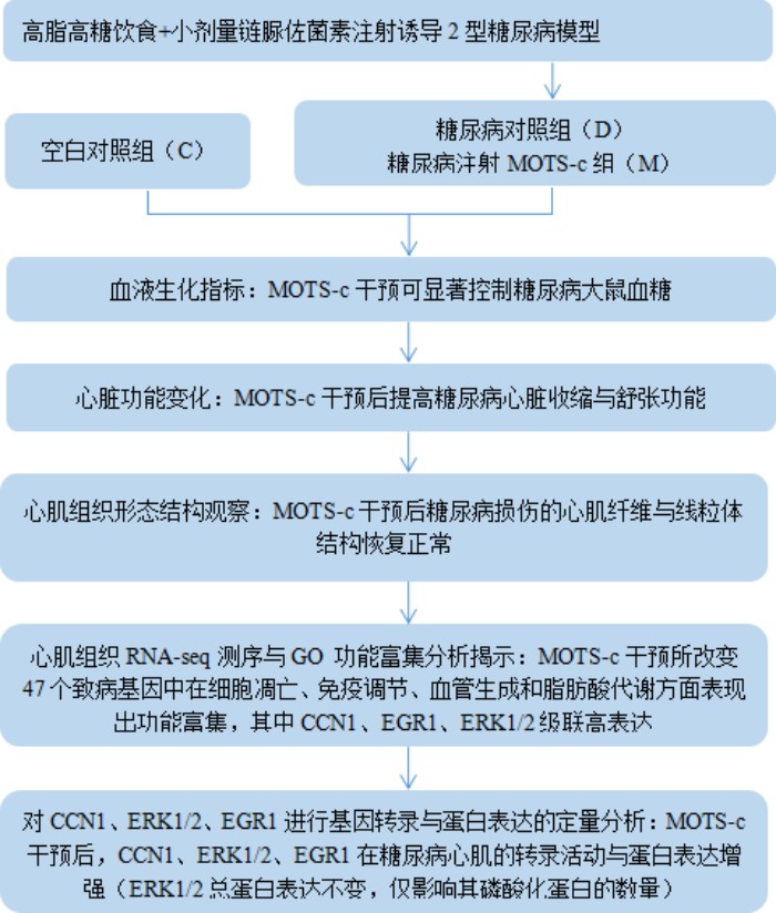 心臟重構(gòu)和功能障礙是糖尿病常見的并發(fā)癥,常導(dǎo)致嚴重的心血管事件。MOTS-c是一種線粒體衍生肽,通過加速葡萄糖攝取和提高胰島素敏感性來調(diào)節(jié)代謝穩(wěn)態(tài)。目前發(fā)現(xiàn),MOTS-c不僅可改善心臟與血管內(nèi)皮功能,且其含量在糖尿病患者血漿中明顯下降,使其成為糖尿病心血管并發(fā)癥的一個新的治療靶點。所以,該研究旨在探究MOTS-c對糖尿病心臟結(jié)構(gòu)與功能的影響并利用轉(zhuǎn)錄組學(xué)技術(shù)挖掘其中的分子機制。