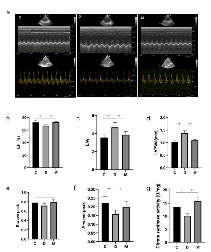 該研究利用透射電鏡測定了MOTS-c對糖尿病心肌超微結(jié)構(gòu)的影響。糖尿病引起心肌纖維排列紊亂和線粒體結(jié)構(gòu)的異常改變,包括心肌細胞排列不規(guī)則、嵴破裂、腫脹和空泡化(圖2)。MOTS-c治療糖尿病大鼠顯著降低心肌線粒體損傷,改善心肌纖維和線粒體結(jié)構(gòu)(圖2)。研究還通過測定檸檬酸合酶的活性,測定了線粒體功能。D組大鼠檸檬酸合酶的活性顯著降低,C組和M組的檸檬酸合酶的活性無統(tǒng)計學(xué)差異(圖3g)。