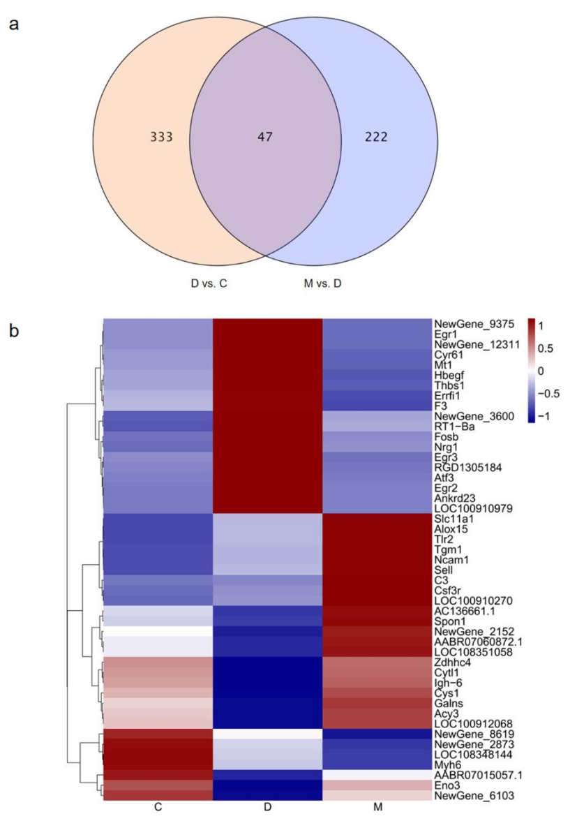 為了進一步探究糖尿病大鼠對MOTS-c的適應(yīng)性反應(yīng)的機制,研究者利用RNA-Seq技術(shù),測定了心肌組織基因全長轉(zhuǎn)錄表達。以C組為對照,D組表現(xiàn)出的差異表達基因(DEGs)即致病基因,再以D組為對照組篩選出M組的差異表達基因,二者篩選出的DEGs中重疊的基因即為MOTS-c改變的致病基因。將以上步驟執(zhí)行,篩選出47個MOTS-c改變的致病基因(圖4a)。將這47個基因進行熱圖分析后發(fā)現(xiàn),C組基因表達趨勢與D組相反,而與M組近似(圖4b)。