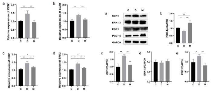 為了驗證CCN1、ERK1/2與EGR1是否在MOTS-c改善糖尿病心臟結(jié)構(gòu)與功能中發(fā)揮重要作用,也為了進一步探究MOTS-c對線粒體發(fā)生的作用,研究者利用RT-PCR與Western Blotting技術(shù)測定了CCN1、ERK1/2、EGR1的基因表達與蛋白表達以及線粒體發(fā)生標(biāo)志蛋白PGC-1α的蛋白表達。結(jié)果表明,MOTS-c治療后,糖尿病大鼠心肌中PGC-1α蛋白表達顯著上升(圖7a);CCN1、ERK1/2和EGR1基因表達顯著降低(圖6);CCN1、EGR1蛋白表達顯著降低,ERK1/2的總蛋白表達量不變(圖7),但多個研究表明MOTS-c僅影響ERK1/2的磷酸化水平。