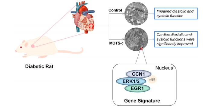 為期8周的MOTS-c治療減少了糖尿病患者的心功能障礙與線粒體損傷,MOTS-c可能是通過調(diào)節(jié)脂肪酸代謝、免疫調(diào)節(jié)、血管生成和細胞凋亡產(chǎn)生作用。CCN1/ERK1/2/EGR1的信號轉(zhuǎn)導(dǎo)可能在MOTS-c抑制心肌細胞凋亡中發(fā)揮重要作用。