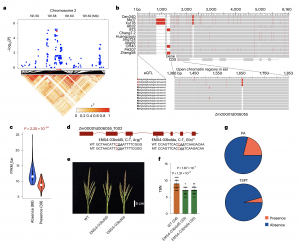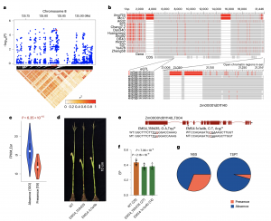 另外,該研究也在14個FILs中鑒定了PAVs,平均鑒定到16,152個PAVs和184個PAV基因(圖3b)。GO富集分析表明,PAV基因在防御反應(yīng)、DNA整合、蛋白質(zhì)磷酸化、萜類生物合成過程、激素介導(dǎo)的信號通路、細(xì)胞氧化解毒等生物過程中富集。將19個野生近緣種和23個地方種的重測序數(shù)據(jù)與14個FILs基因組進(jìn)行比對,在至少一份大芻草或地方種質(zhì)中,平均檢測到93.4%的FIL特異性序列的密切相關(guān)同源物,與之前的報道一致,這些PAVs中的大多數(shù)都是來源于玉米祖先種中存在的變異。