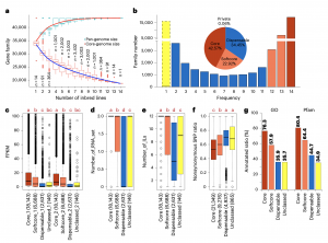 通過模擬分析發(fā)現(xiàn),總基因集隨著基因組的增加而增加,當(dāng)n=12時接近穩(wěn)定(圖2a),表明這14個玉米足夠具有代表性。核心基因的百分比隨著玉米數(shù)量的增加而下降,但即使當(dāng)n=14時也沒有穩(wěn)定下來,表明玉米擁有大量的非共享基因。