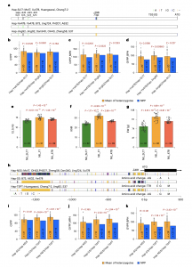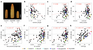 之前研究報道了雜種優(yōu)勢與分子遺傳距離(GD)存在弱正相關(guān)關(guān)系。本研究為了研究產(chǎn)量雜種優(yōu)勢與遺傳變異之間的關(guān)系,首先將基因組劃分為共線性和和非共線性區(qū)域。相關(guān)分析顯示,共線性區(qū)域長度與GYPP的BPH呈顯著負(fù)相關(guān)(圖5b)。共線性區(qū)域的SNPs和small InDels僅與GYPP的BPH呈弱相關(guān) (圖5c和5d)。相反,非共線性區(qū)域長度、SV_Number和PAV_Number均與GYPP的BPH呈顯著正相關(guān)(圖5e-g)。其中,SV_Number與GYPP雜種優(yōu)勢表現(xiàn)出強的相關(guān)性(圖5f)。SVs可以進(jìn)一步分為插入或缺失、串聯(lián)收縮擴張和重復(fù)收縮擴張。其中,插入缺失與GYPP雜種優(yōu)勢的相關(guān)性強。綜上所述,表明SVs的數(shù)量對GYPP的貢獻(xiàn)很顯著,支持了SVs在雜種優(yōu)勢中起主導(dǎo)作用這一觀點。