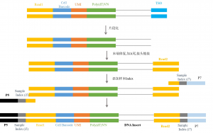 接下來進(jìn)入單細(xì)胞測序的第三環(huán)節(jié)–文庫構(gòu)建。文庫構(gòu)建可分為三個部分:DNA片段化/末端修復(fù)/添加A尾、接頭連接和Index PCR(PCR富集)。