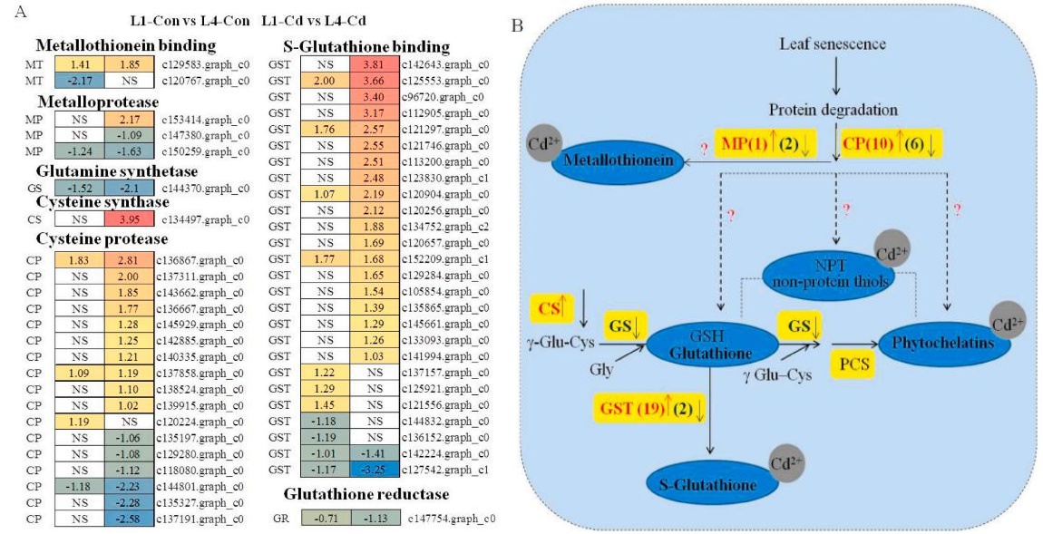 MT(金屬硫蛋白)是一組金屬結(jié)合蛋白,在金屬分配和穩(wěn)態(tài)中起著關(guān)鍵作用。1個上調(diào)基因(c129583.Graph_c0)和一個下調(diào)基因(c120767.graph_c0)編碼MT。Cd脅迫使上調(diào)基因的差異倍數(shù)比對照增加了23.8%,并完全抑制了表達下調(diào)的基因。結(jié)合Cd脅迫下MT含量的增加,作者的研究結(jié)果表明,MT-Cd結(jié)合可能在幼葉(L1)和衰老葉片(L4)的Cd解毒過程中發(fā)揮作用。半胱氨酸蛋白酶(CPs)是葉片衰老過程中負責(zé)蛋白水解活性的最豐富的酶。在該轉(zhuǎn)錄組中鑒定出17個編碼CP的基因。在對照組中,只有4個基因的表達有顯著差異。Cd脅迫顯著促進CP表達,有10個上調(diào)基因在Cd處理組的差異倍數(shù)高于處理組,Cd處理組的6個基因下調(diào)倍數(shù)低于對照組。然而,PC的蛋白水解活性是否與衰老葉片中Cd的積累有關(guān)尚不清楚。