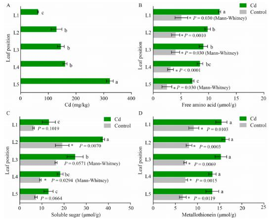 不同葉片Cd積累量顯著不同。葉片Cd濃度隨葉片數(shù)量的增加從上到下顯著增加,L2、L3、L4和L5的Cd濃度比幼葉(L1)增加了2.1、2.3、2.5和5.1倍。幼葉(L1)積累Cd最少,而衰老葉(L5)積累Cd最多。Cd處理顯著提高了各葉片游離氨基酸含量,但沒有改變其隨葉片衰老逐漸下降的趨勢,幼葉中游離氨基酸含量(L1)最高,然后隨著葉片衰老逐漸降低(圖1B)。衰老葉(L5)中游離氨基酸含量最低。成熟葉片中可溶性糖含量(L2)最高,Cd處理顯著提高了L2和L4的可溶性糖含量,然后隨著葉片衰老逐漸降低。衰老葉(L5)和幼葉(L1)的可溶性糖含量顯著低于綠色成熟葉。鎘脅迫下,與對照組相比,Cd處理顯著提高了所有葉片中的金屬硫蛋白含量,不同葉片金屬硫蛋白含量無顯著變化。