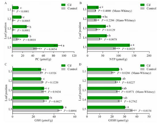 PC、GSH和NPT參與了超積累劑的Cd解毒機。Cd脅迫和對照組的植物螯合素(PCs)均隨葉片老化顯著增加。Cd處理顯著提高了各葉片PC含量,非蛋白硫醇(NPTs)含量也隨著葉片衰老而顯著增加,但隨葉片衰老的增加趨勢沒有變化。Cd處理顯著增加了衰老葉片(L4和L5)的谷胱甘肽(GSH)含量,但沒有提高幼苗和成熟苗的GSH含量。由此可以推斷,GSH、PC和NPT的增加及其與Cd的結(jié)合可能促進了衰老葉片中Cd的積累。Cd處理顯著增加了幼葉和成熟葉的氧化谷胱甘肽(GSSH)含量(L1和L2),但降低了衰老葉(L5)的GSSH含量。由于氧化后的谷胱甘肽(GSSH)可被還原為還原型谷胱甘肽(GSH),還原性谷胱甘肽(GSH)可以通過GST進一步催化GSH-Cd結(jié)合,GSSH向GSH的轉(zhuǎn)化與Cd在衰老葉片中的積累是一致的。