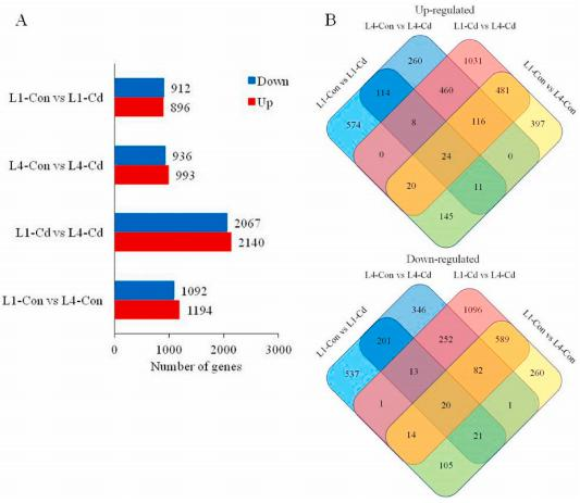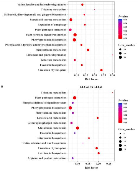 為了了解差異基因的功能,作者進行了GO富集分析。四組的差異基因在節(jié)律過程、信號傳導(dǎo)和代謝過程等生物過程中都有20個豐富的分類。值得注意的是,與對照組相比,脫毒組的差異基因在幼葉和衰老葉中都有富集(L1-ConvsL1-Cd和L4-ConvsL4-Cd),但在幼葉和衰老葉的對照組和處理組中沒有明顯富集(L1-CdvsL4-Cd和L1-ConvsL4-Con)。