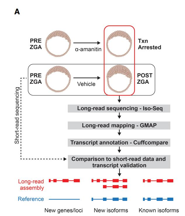 3、全長(zhǎng)轉(zhuǎn)錄組測(cè)序:選取正常的胚胎和 RNA 聚合酶抑制劑α-鵝膏毒素處理的胚胎進(jìn) 行三代全長(zhǎng)轉(zhuǎn)錄組測(cè)序。