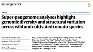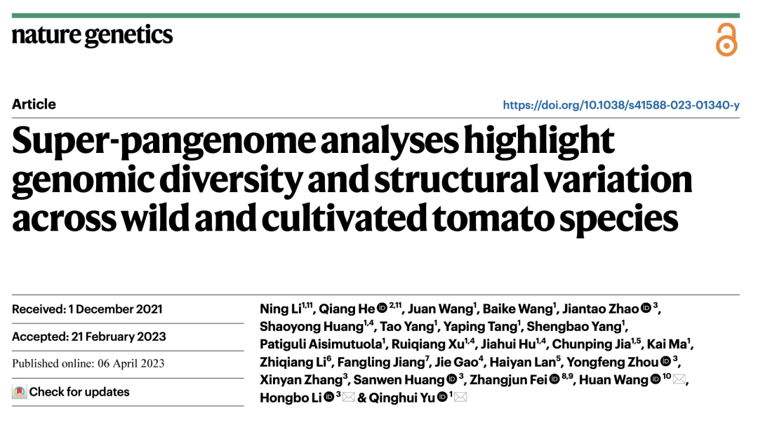 2023年4月6日Nature Genetics《自然·遺傳學(xué)》發(fā)表了由新疆農(nóng)業(yè)科學(xué)院園藝作物研究所牽頭,中國農(nóng)業(yè)科學(xué)院深圳農(nóng)業(yè)基因組研究所、作物科學(xué)研究所、生物技術(shù)研究所等團(tuán)隊(duì)合作完成的題為Super-pangenome analyses highlight genomic diversity and structural variation across wild and cultivated tomato species的研究論文。該研究繪制了11個(gè)野生和栽培番茄的染色體級(jí)別高質(zhì)量基因組圖譜,闡明了茄屬番茄組(Solanum?section?Lycopersion)的基因組演化歷史,構(gòu)建了番茄超級(jí)泛基因組/圖基因組,并進(jìn)一步在野生番茄中克隆到可大幅提升栽培番茄產(chǎn)量的新基因一個(gè)。該研究既是對(duì)番茄基因組資源的重要補(bǔ)充,同時(shí)也對(duì)其它作物基因組學(xué)研究和野生種質(zhì)資源尤其是近緣野生種的利用具有重要啟發(fā)意義。該成果也是新疆農(nóng)業(yè)科學(xué)院首次以第一單位在Nature Genetics上發(fā)表長篇研究論文。?百邁客為本研究提供了相關(guān)測序及分析服務(wù)。