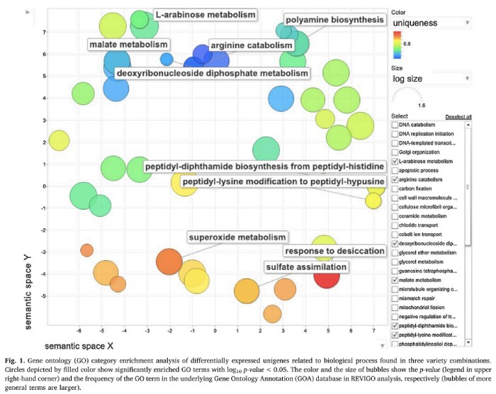 對差異表達(dá)的基因進(jìn)行 GO 富集分析。在生物過程類別中,主要與超氧化物酶代謝,精氨酸分解代謝,蘋果酸代謝和多胺生物合成有關(guān)。分子功能類別中的富集類別為硫氧還蛋白活性,固醇結(jié)合,L-蘇氨酸氨裂解酶活性和富馬酰乙酰乙酸酶活性。在細(xì)胞成分類別中,主要為高爾基體堆積,小亞基加工體,細(xì)胞外間隙和 1,3-β-D-葡聚糖合酶復(fù)合體。