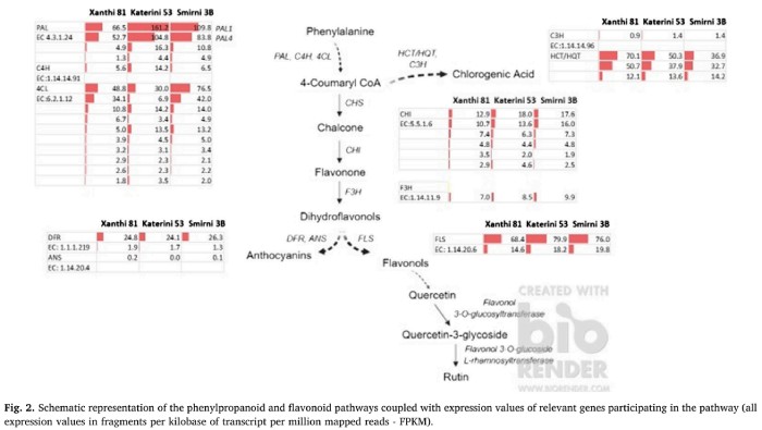 查爾酮合酶(CHS)是類黃酮生物合成中的關(guān)鍵酶。研究者發(fā)現(xiàn)兩個(gè) CHS基因在三個(gè)煙草品種的葉片中均低表達(dá),因?yàn)?CHS 主要在花中組成性表達(dá),但其表達(dá)主要是由非生物/生物脅迫誘導(dǎo)的。注釋為 CHS-1B 或 CHS2 的Nitab4.5_0002920g0060.1 在’Katerini 53’和’Xanthi 81’中略有上調(diào),但第二個(gè)注釋為 III 型聚酮化合物合酶(NCBI:XP_016446648.1)差異很小。所有 CHI 基因也僅以低水平表達(dá),在鑒定的結(jié)果中 F3H 也沒有差異。另一方面,鑒定了兩個(gè)參與黃酮醇形成的 FLS 基因。FLS1(Nitab4.5_0005357g0020.1)(NCBI:LOC107794305)的表達(dá)最高,而 NtFLS(Ni-tab4.5_0006276g0010.1)的表達(dá)低得多。這兩個(gè)基因在品種之間沒有差異表達(dá)。還檢測到有助于花色苷生物合成的基因,例如 DFR 和 ANS。DFR 中第一個(gè)僅適度表達(dá),另外一個(gè)沒有差異。ANS(Nitab4.5_0003274g0110.1)幾乎未表達(dá)(圖 2)。蘆丁是一種黃酮醇糖苷,在花青素途徑生物合成,其中包括黃酮醇 3-O-葡萄糖基轉(zhuǎn)移酶和黃酮醇 3-O-葡萄糖苷胰島素轉(zhuǎn)移酶。結(jié)果表明低表達(dá)的 4 種黃酮醇 3-O-糖基轉(zhuǎn)移酶和 2種黃酮醇 3-O-糖苷胰島素轉(zhuǎn)移酶在“Smirrni 3B”和“Xanthi 81”比“Katerini 53”中表達(dá)更高、更多。