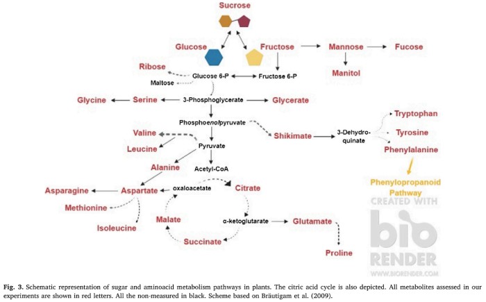 采集“Katerini 53”,“Xanthi 81”和“Smirrni 3B”葉片樣品,并使用氣相色譜GC-MS 和 LC-MS / MS 方法進(jìn)行代謝分析?;蛐皖A(yù)先鑒定為不同的色譜模式,共有 78 種代謝化合物(包括糖,氨基酸,有機(jī)酸)差異積累,如圖 3 所示。詳細(xì)的非靶向 GC-MS 代謝組學(xué)分析用于鑒定煙葉中產(chǎn)生的大多數(shù)主要代謝產(chǎn)物。在本研究中,所測得的最豐富的可溶性糖是果糖,葡萄糖,半乳糖和蔗糖。在果糖和蔗糖中檢測到統(tǒng)計(jì)學(xué)差異;“Katerini 53”中的果糖含量更高,而“Smierni 3B”中的蔗糖含量更高?!癒aterini 53”與其它兩個(gè)品種相比葡萄糖和半乳糖水平較高,差異無統(tǒng)計(jì)學(xué)意義。在可溶性醇中,兩個(gè)豐富的代謝產(chǎn)物是山梨糖醇和肌醇,但在品種之間未檢測到統(tǒng)計(jì)學(xué)上的顯著差異。這三個(gè)品種中的蘋果酸含量沒有任何統(tǒng)計(jì)上顯著不同。“Xanthi 81”葉子的氨基酸含量最高,但谷氨酸和 γ-氨基丁酸(GABA)除外。GABA 和脯氨酸是煙葉中的主要氨基酸。與其他兩個(gè)品種相比,“Smirrni 3B”中的 GABA 水平明顯更高。’Smirrni 3B’和’Xanthi 81’中的脯氨酸水平較高,而“Katerini 53”的脯氨酸水平最低。在“Smirrni 3B”中檢測到了高濃度的甘氨酸和絲氨酸這兩種必需氨基酸。煙草生物堿在根部合成,然后轉(zhuǎn)運(yùn)到葉片。生物堿、尼古丁與植物抗草食動物防御有關(guān)。在三個(gè)品種中檢測到的尼古丁濃度在統(tǒng)計(jì)學(xué)上有顯著差異。結(jié)果表明,“Xanthi 81”的尼古丁濃度最高,而“Smirrni 3B”的尼古丁濃度最低。與“Katerini 53”相比,“Xanthi 81”中腐胺的含量有所降低,但其濃度仍高于“Smirrni 3B”。鑒定了所有擬參與煙草中尼古丁生物合成的相應(yīng)基因,但僅發(fā)現(xiàn)少數(shù)幾個(gè)在成熟葉片中表達(dá)。然而,基因 XS 和 QPT(三分之二)在“Xanthi 81”中表達(dá)較高。與其它兩個(gè)品種相比,這與“Xanthi 81”葉片中較高的尼古丁含量相關(guān),這表明它可能是遺傳控制的。
