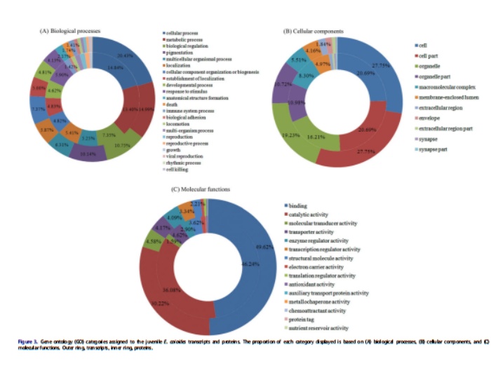 對差異表達的基因和蛋白質的功能進行了分類。共有11417個轉錄本和3210種蛋白質被分為三大類:生物學過程、細胞成分和分子功能(圖3)。28788個GO被注釋到11417個映射的轉錄本,10506個GO注釋到3210個蛋白質中。參與“細胞過程”和“代謝過程”的基因和蛋白質是生物學過程中較大的兩類,分別占轉錄本的20.4%和15.0%,以及14.8%和13.4%的蛋白質。在細胞成分類別中,基因和蛋白質涉及“細胞”(27.8%份轉錄本和20.7%份蛋白質)、“細胞部分”(27.8%份轉錄本和20.7%份蛋白質)和“細胞器”(19.2%份轉錄本)。在分子功能類別中,“結合”占49.6%個基因和46.2%個蛋白質,30.2%個轉錄本和36.1%個蛋白質具有“催化活性”(圖3(C))。