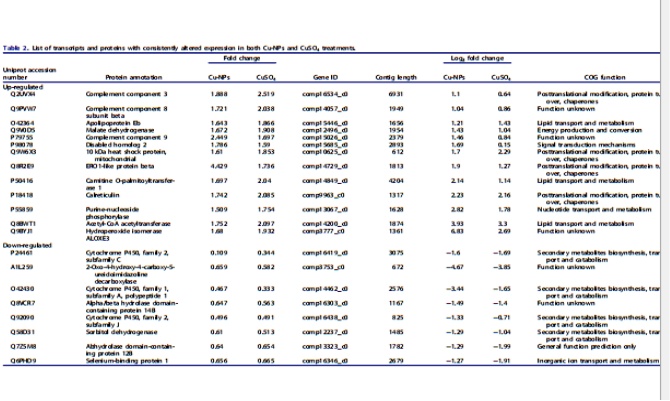 用蛋白質組學分析方法獲得的差異表達蛋白與mRNA進行了比較分析;根據(jù)他們的氨基酸序列來匹配轉錄本,在Cu-NPs組與對照組及CuSO4和對照組相比較,分別共140(100%)和352(99.4%)個差異表達的蛋白。我們進一步確定在兩種銅粒子下蛋白和基因的表達是否一致,發(fā)現(xiàn)21的轉錄和蛋白在同一方向改變(13個上調,八個下調)(表2)。有趣的是,大多數(shù)基因(16個基因)的表達在Cu-NPS比CuSO4更強烈,但是蛋白質卻相反。