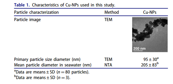 Cu-NPS呈顆粒狀,呈團聚狀,海水中的平均粒徑(205±83 nm)大于實驗主要的粒徑(95±30 nm)。(見下表)