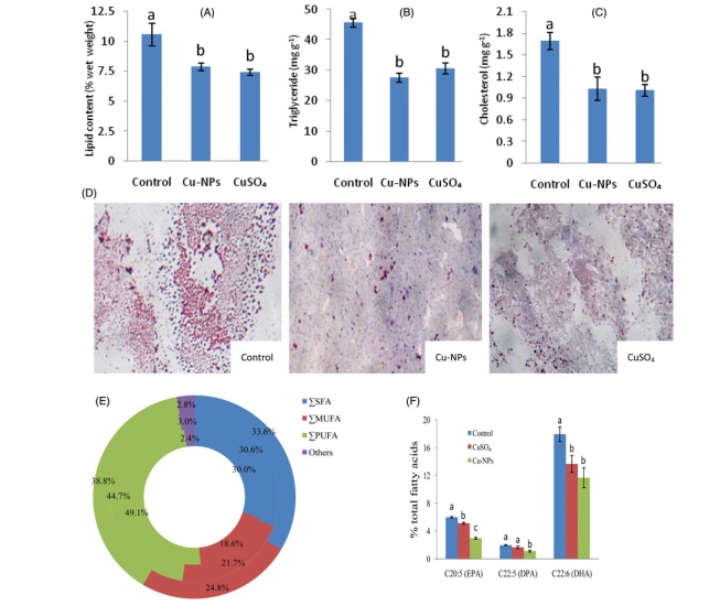 與對照組相比,在兩種銅形式下,肝臟中脂類、甘油三酯和膽固醇含量均顯著降低,但兩種銅形式下相比無顯著性差異(P>0.05)。正常脂質積累(紅色染色表明的脂滴)在對照組中明顯增加,而Cu-NPS或硫酸銅暴露則減少了脂滴的數(shù)量(圖5(D)),任何一種銅暴露均降低了總多不飽和脂肪酸,但總單不飽和脂肪酸和總飽和脂肪酸(Psfa)較對照組增加,而在Cu-NPS中,多不飽和脂肪酸(圖5(E))的作用更為明顯(圖5(E))。與對照相比,cu-nps或硫酸銅暴露后,脂肪酸、二十碳五烯酸(epa,c20:5)、二十二碳六烯酸(dha,c22:6)和二十二碳五烯酸(dpa,c22:5)均下降,而cu-nps中脂肪酸組分的含量比cu-nps明顯增加(圖5(F))。