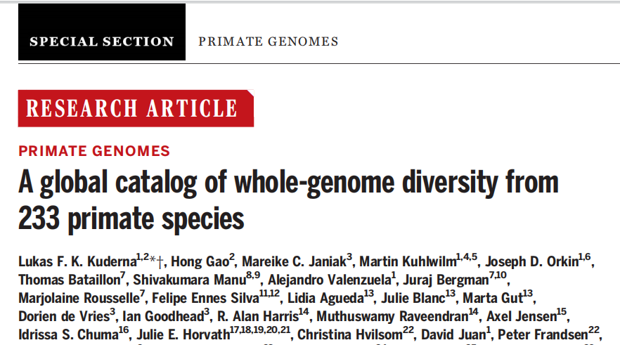 題目:233種靈長類物種全基因組多樣性比較分析