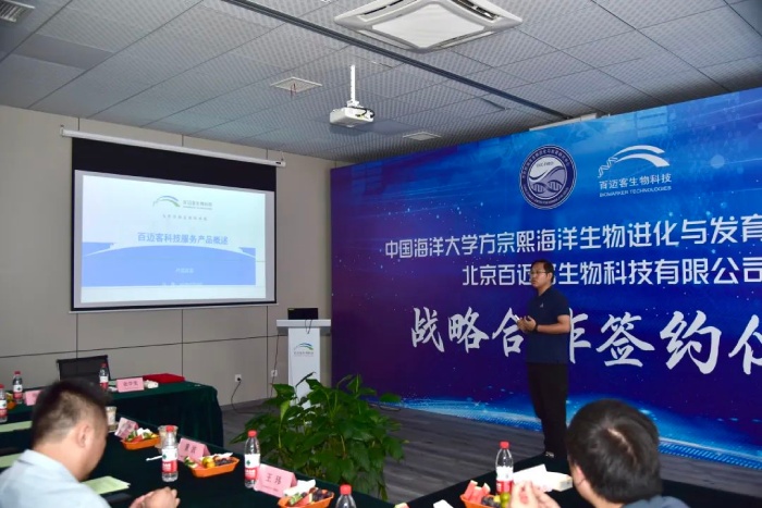 百邁客生物創(chuàng)始人兼CEO鄭洪坤先生,中國海洋大學(xué)董波教授,中國海洋大學(xué)王師教授,中國海洋大學(xué)王瑋教授,百邁客生物智能制造副總裁劉敏先生,百邁客生物生產(chǎn)研發(fā) 副總裁張雪川先生和北京百邁客產(chǎn)品總監(jiān)張學(xué)雯等人共同出席了本次會議合作簽約儀式。