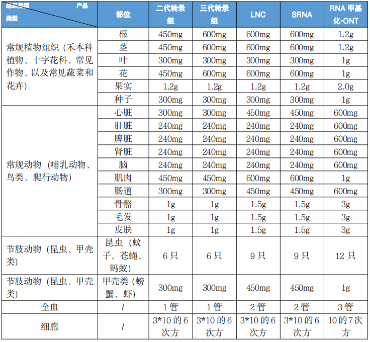 2) 組織送樣量:建議送樣量適用于 95%的物種組織,少部分組織因胞內(nèi)核酸量較低,需適當(dāng)增加送樣量,比如動物皮膚、毛發(fā),植物果實、根等。請嚴(yán)格按照上方組織送樣量要求送樣,送樣量過少或過多均不利于提取實驗。采樣量較少會導(dǎo)致提取的 RNA 總量、濃度不合格,采樣量過多反而會造成速凍不徹底、提取取樣困難、凍融降解等危險。
