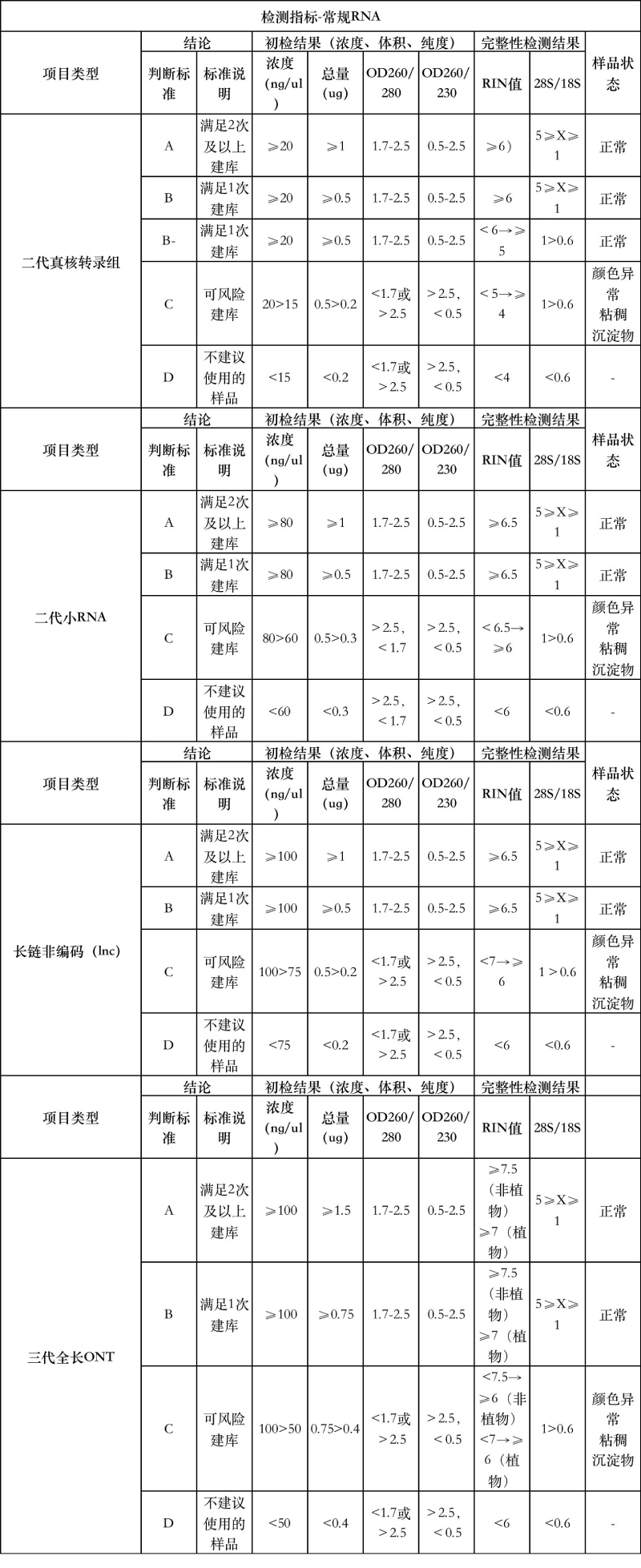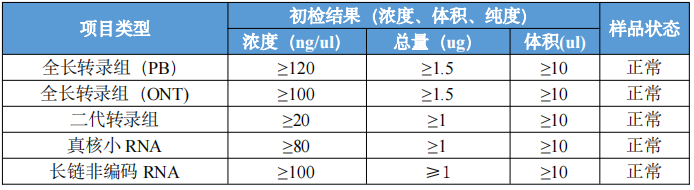 2、以上均是單個文庫的總量要求,如果樣品做多個文庫按(小 RNA>LNCRNA>轉(zhuǎn)錄組 RNA)判。總量不足的文庫有樣品判 C 不通過,無不合格原因,根據(jù)二次提取的總量判定。無樣品根據(jù)剩余總量判判定下一文庫。