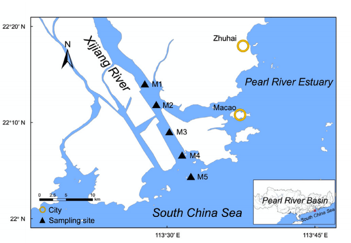 • 從M1到M5的采樣點(diǎn)鹽度升高,每對采樣點(diǎn)之間有顯著差異(P < 0.05);
