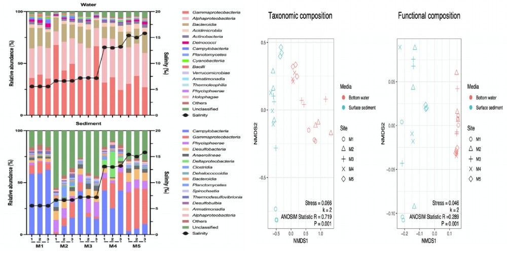• 由于SWI對沉積細(xì)菌群落有主要影響,對M1(低鹽度)和M5(高鹽度)進(jìn)行了宏基因組測序。通過NMDS分析,沉積物細(xì)菌群落的病灶組成清晰分離;