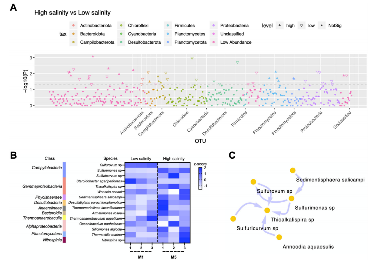 • 沉積性細(xì)菌群落中最豐富的15個(gè)細(xì)菌OTUs來自10個(gè)類別,其中彎曲桿菌和伽馬變形菌門是最重要的類群,各有3種。與此同時(shí),有11個(gè)物種在高鹽度中富集,包括硫脲、硫單胞菌、彎曲桿菌、硫堿桿菌、熱厭氧菌等;