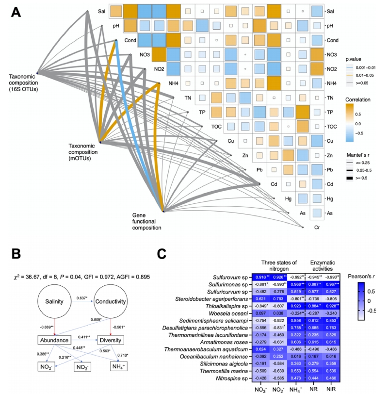 • 鹽度、電導(dǎo)率和細(xì)菌豐度之間存在正相關(guān)關(guān)系,沉積物中不同的氮形態(tài)有順序的參與;