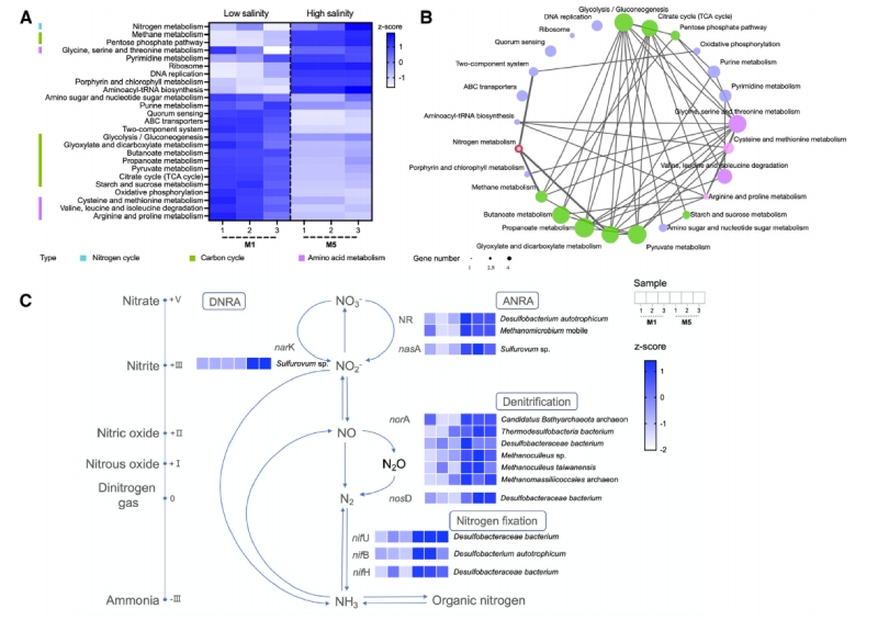 • 功能基因通過KEGG途徑富集的結(jié)果表明,氮代謝相關(guān)功能基因在高鹽環(huán)境下的表達(dá)水平高于低鹽環(huán)境,而碳和氨基酸代謝相關(guān)功能基因在低鹽環(huán)境下的表達(dá)水平高于高鹽環(huán)境。這表明SWI通過建立鹽度梯度刺激氮循環(huán);