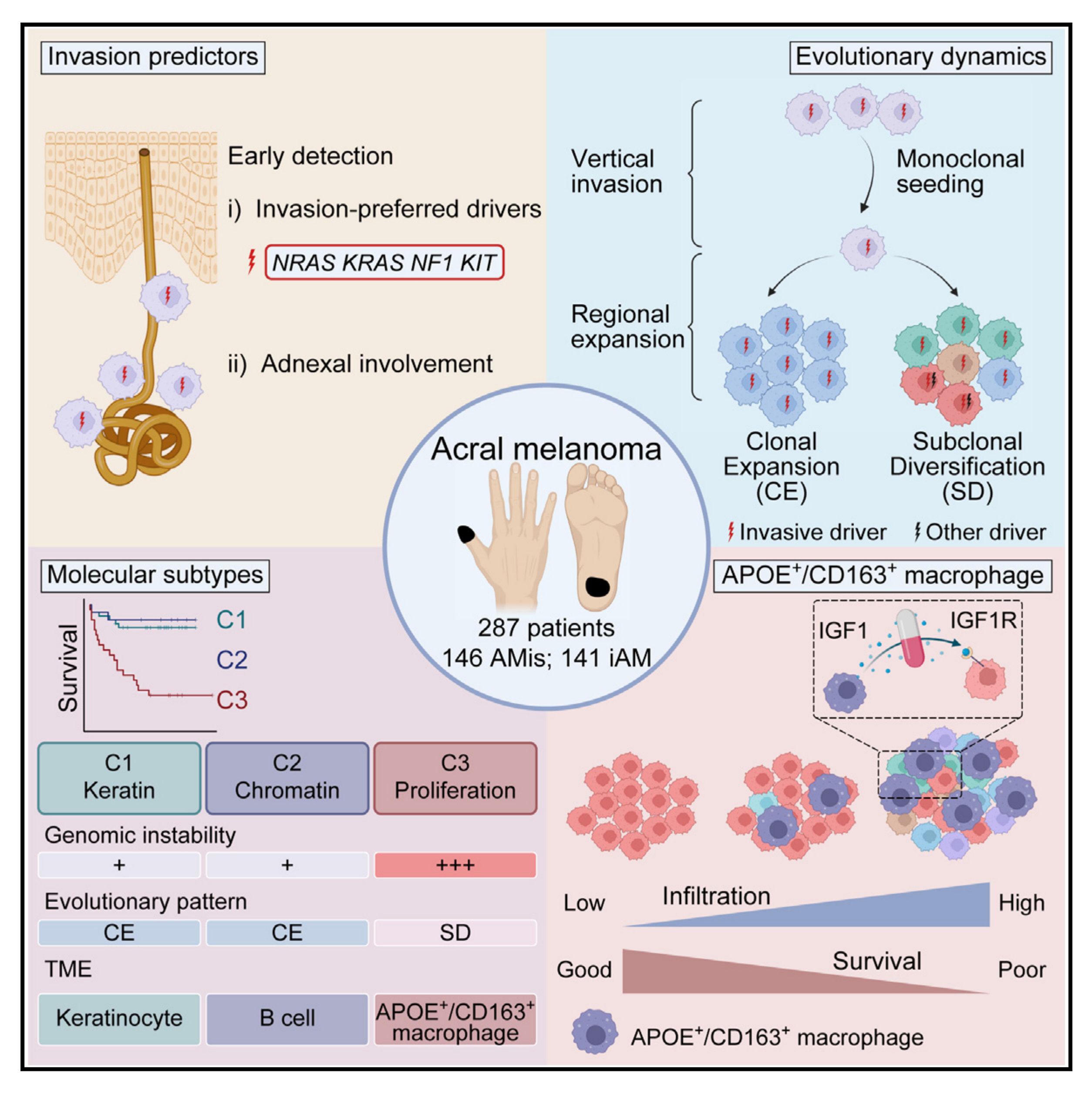 2024年5月16日,北京大學(xué)第一醫(yī)院的張寧、李航及北京大學(xué)-云南白藥國(guó)際醫(yī)學(xué)中心薛瑞棟團(tuán)隊(duì)合作在《Cancer Cell》在線發(fā)表題為《Integrative molecular and spatial analysis reveals evolutionary dynamics and tumor-immune interplay of in situ and invasive acral?melanoma》的研究論文,對(duì)肢端型黑色素瘤進(jìn)行了多組學(xué)分析,解析了從AMis進(jìn)展到iAM的克隆演化規(guī)律,建立了AM的分子分型,揭示了APOE+/CD163+巨噬細(xì)胞的空間富集狀態(tài),進(jìn)一步通過實(shí)驗(yàn)證實(shí)該巨噬細(xì)胞亞群可通過IGF1-IGF1R互作促進(jìn)腫瘤發(fā)生上皮-間質(zhì)轉(zhuǎn)化,最終鑒定出附屬器受累和驅(qū)動(dòng)突變可預(yù)測(cè)AMis的侵襲潛能,而APOE和CD163則可用于預(yù)測(cè)iAM的預(yù)后,為肢端型黑色素瘤的早期診斷和臨床診療提供了重要依據(jù)。
