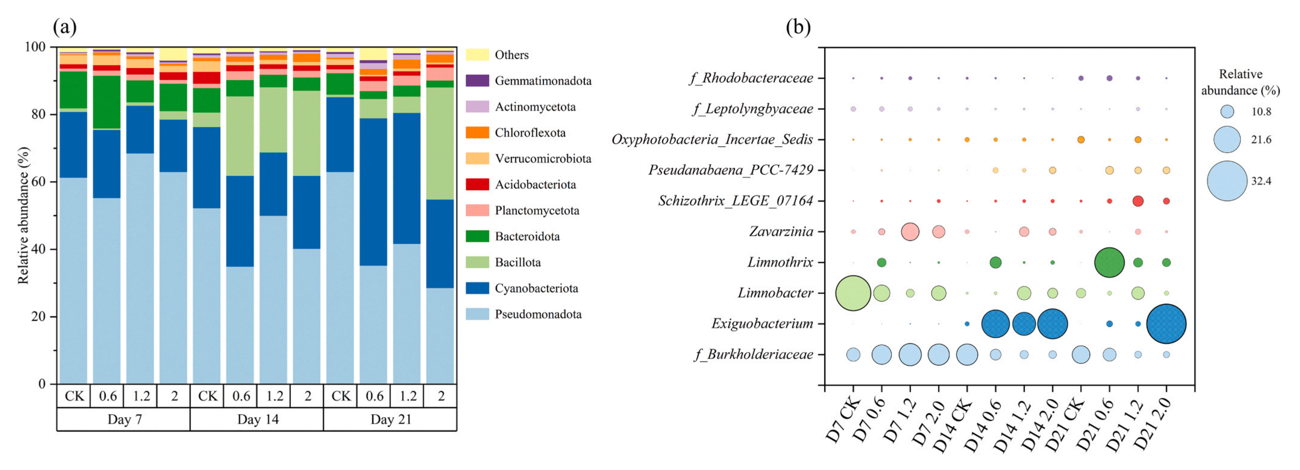 門水平的細菌群落組成結果顯示了微生物群落對Al暴露的動態(tài)響應(圖3a)。變形菌門(28.64% ~ 68.58%)、藍細菌門(14.15% ~ 43.74%)、厚壁菌門(0.48% ~ 33.24%)和擬桿菌門(2.10% ~ 15.60%)是所有附著生物膜樣品中的優(yōu)勢菌群,廣泛存在于苦草葉片的附著生物膜。同時,變形菌門和擬桿菌門在各處理組中均占優(yōu)勢地位。然而,在濃度分別為1.2 mg/L和2.0 mg/L的Al處理21天后,兩個門的相對豐度均顯著低于CK組,說明這些細菌的增殖受到了Al暴露的影響。