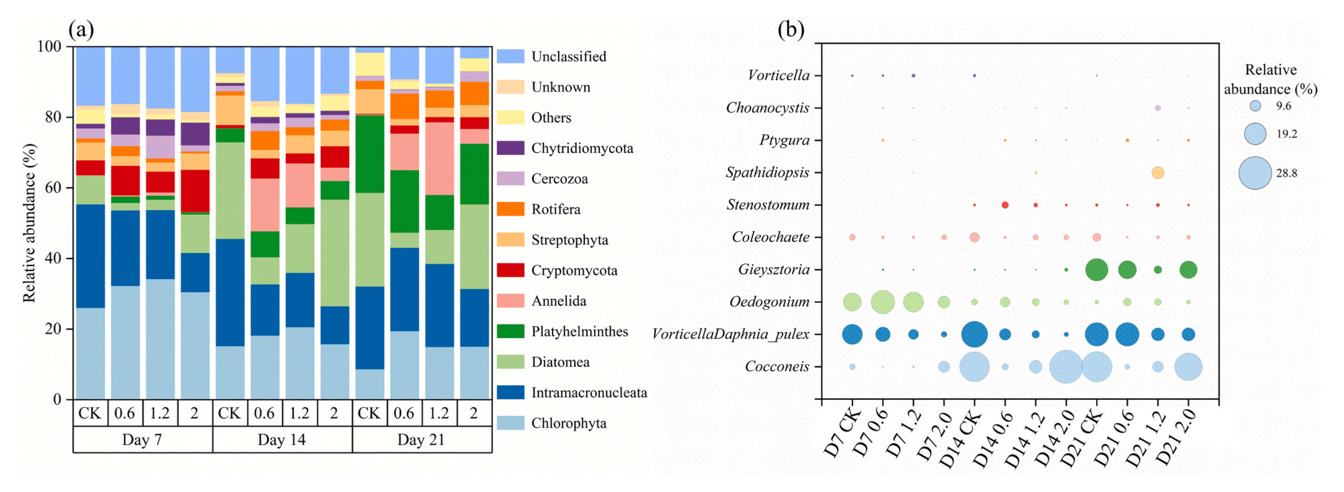 圖5-每個生物膜樣品中相對豐度最高的十個微型真核生物門(a)和屬(b)。D7、D14和D21表示第7天、第14天和第21天。圓圈(b)與所有樣本中每個屬的相對豐度成比例。