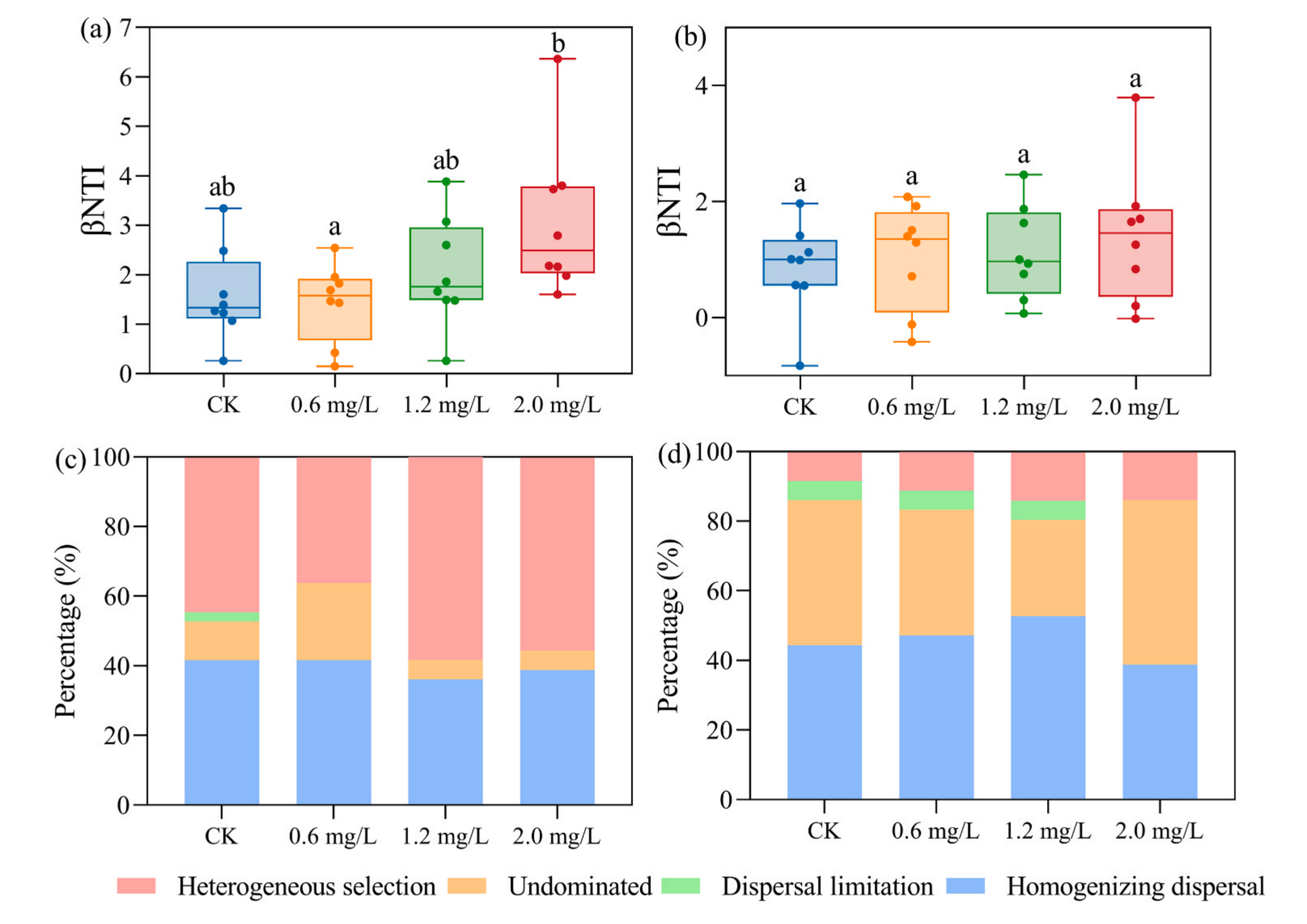 圖6-不同處理組中細菌(a)和微型真核生物(b)的βNTI分布。細菌(c)和微型真核生物(d)群落組裝的周轉百分比主要由不同的隨機過程(dispersal limitation and homogenizing dispersal)和確定性過程(homogeneous selection)決定,以及處理中不受任何單一過程(Undominated)控制的百分比。
